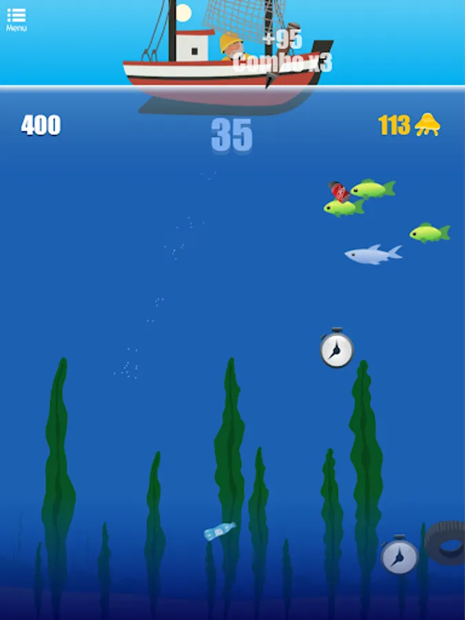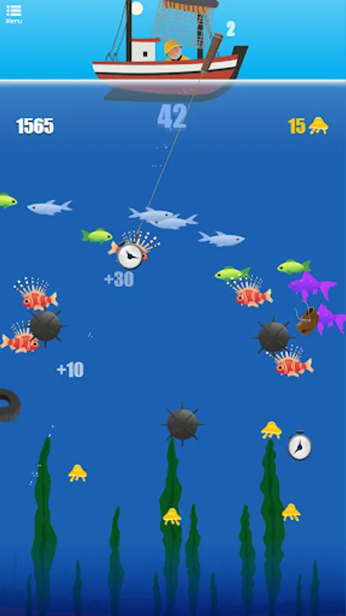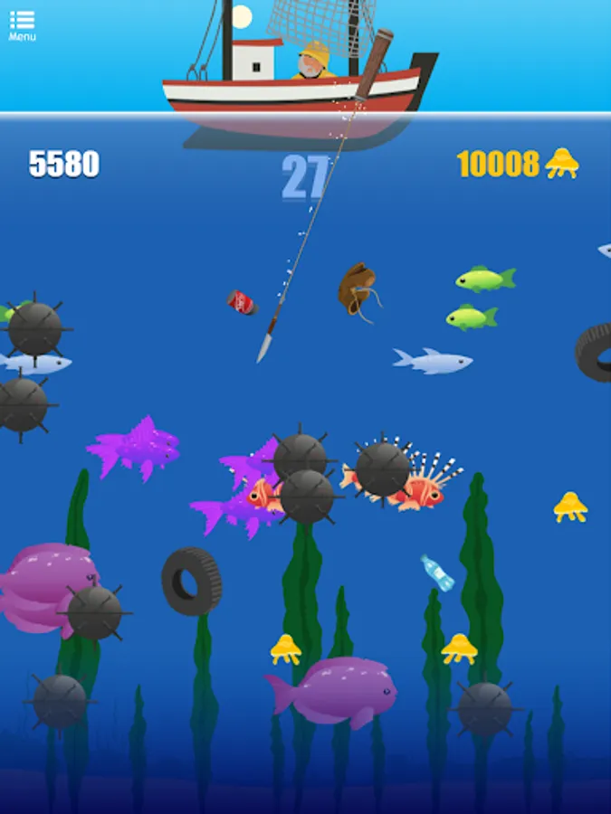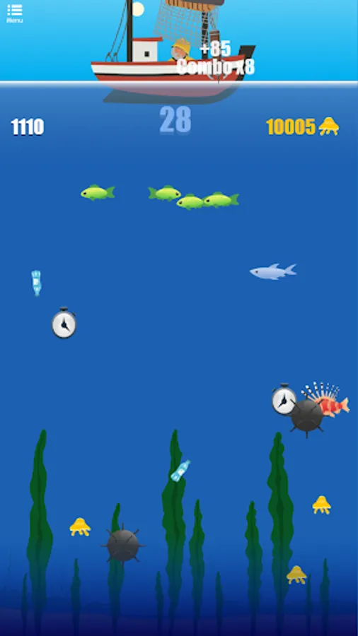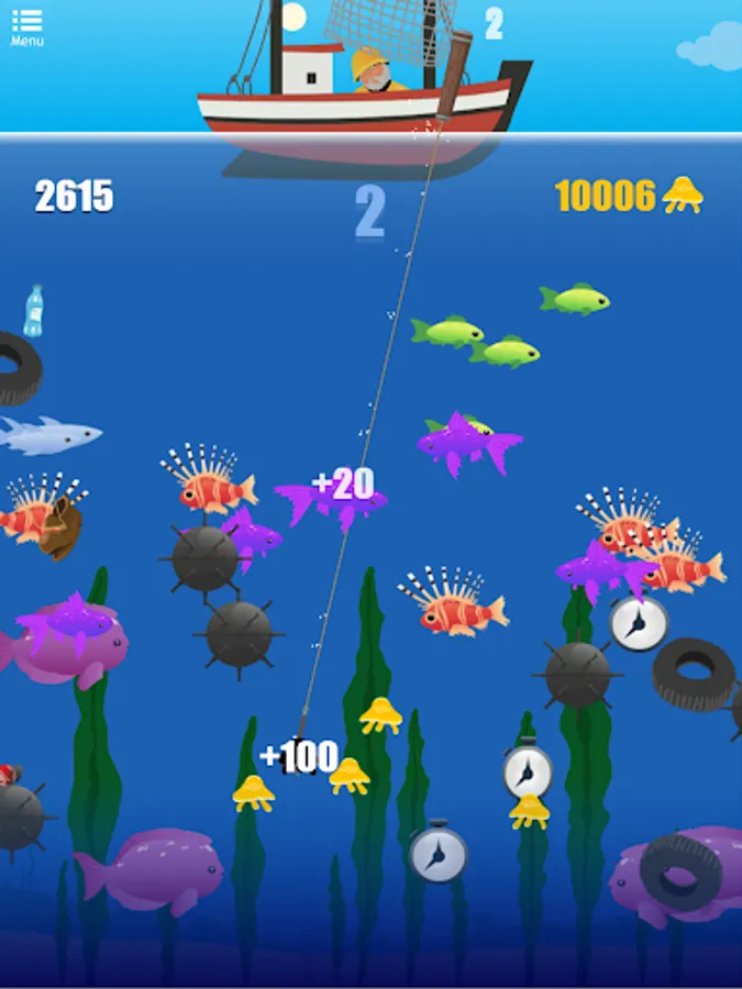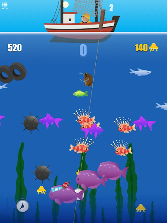 Cast your hook as deep as possible into the ocean, to reel back as many fish as you can. The more different kind of fishes you hit, the better score and rewards you get! Catch watches to extend the time and keep fishing. Shoot wisely, if you hit the garbage your harpoon will get stuck and you'll lose time and points. And watch out for the bombs! Try to avoid them as you catch fish, otherwise theyβll explode and all your capture will disappear!