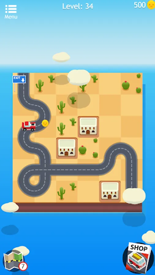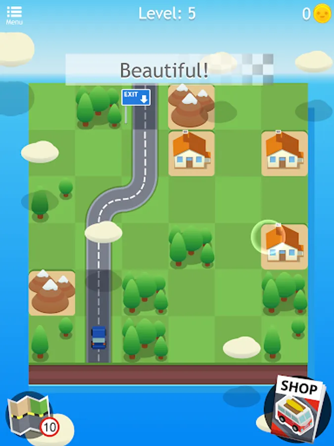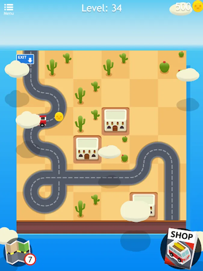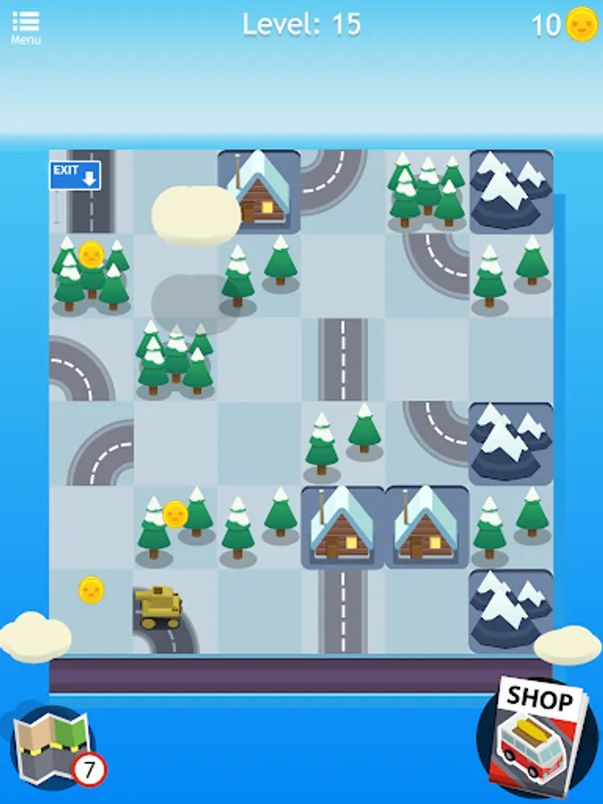 During your travel through this world of puzzles, be sure to pick up the little roadmaps you find along the way because you can use them as a hint! They'll help you move forward with confidence by fitting a part of the highway on the right spot. And don’t worry if you run out of hints, you can get more! There are also bonus gold coins for the taking if you make all the right moves, use them to get some hints packs for those hard levels or you can spend them on new amazing cars like mini-vans, muscle cars or even a tank! Complete a level and train your brain with style!