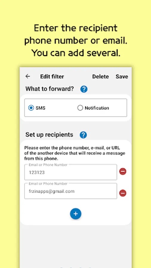 2. Enter the recipient phone number, email, URL, Telegram, Push Service ID. You can add several.