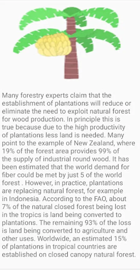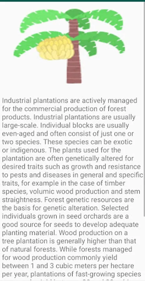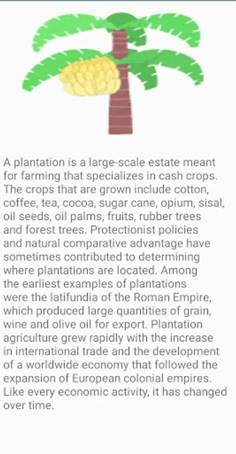 A plantation is a large-scale estate meant for farming that specializes in cash crops. The crops that are grown include cotton, coffee, tea, cocoa, sugar cane, opium, sisal, oil seeds, oil palms, fruits, rubber trees and forest trees. Protectionist policies and natural comparative advantage have sometimes contributed to determining where plantations are located.