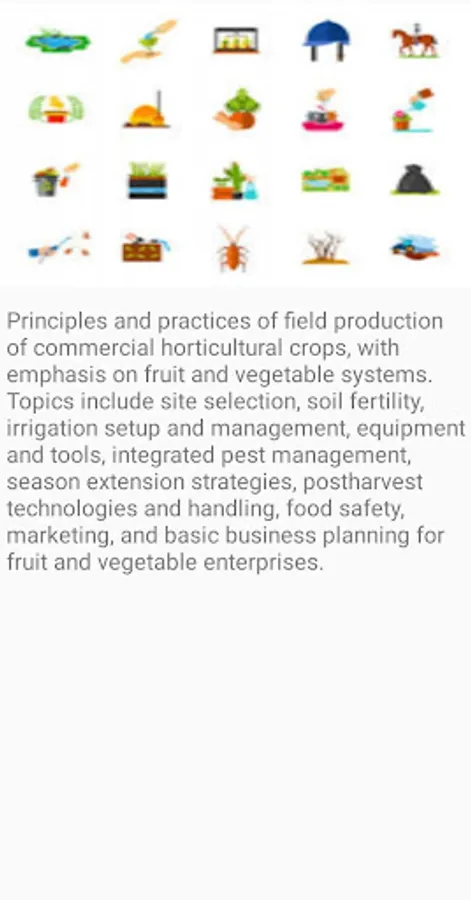 Principles and practices of field production of commercial horticultural crops, with emphasis on fruit and vegetable systems. Topics include site selection, soil ...