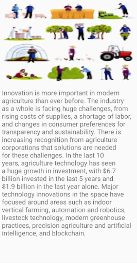 Innovation is more important in modern agriculture than ever before. The industry as a whole is facing huge challenges, from rising costs of supplies, a shortage of labor, and changes in consumer preferences for transparency and sustainability. There is increasing recognition from agriculture corporations that solutions are needed for these challenges. In the last 10 years, agriculture technology has seen a huge growth in investment, with $6.7 billion invested in the last 5 years and $1.9 billion in the last year alone. Major technology innovations in the space have focused around areas such as indoor vertical farming, automation and robotics, livestock technology, modern greenhouse practices, precision agriculture and artificial intelligence, and blockchain.