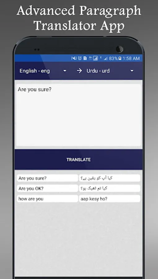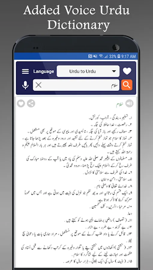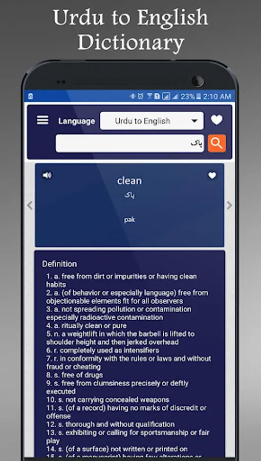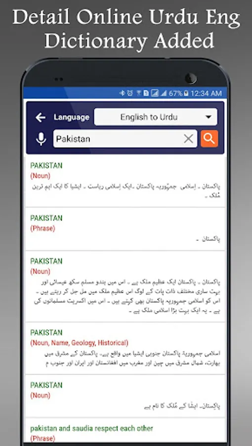 English to Urdu, Urdu to English Offline Dictionary contain 300,000+ words with Free Multilingual Paragraph Translators Apps. if you studying and you want to know the meaning of word. this app has huge offline database of English and Urdu words, so no matter you can search both English and Urdu to find the meanings of your respective words. it is complete offline English and Urdu Dictionaries. 100% free Offline dictionary and work like English to Urdu translator. There is auto suggestion so you not need type full words. you can also enter a word using Speech to text feature.