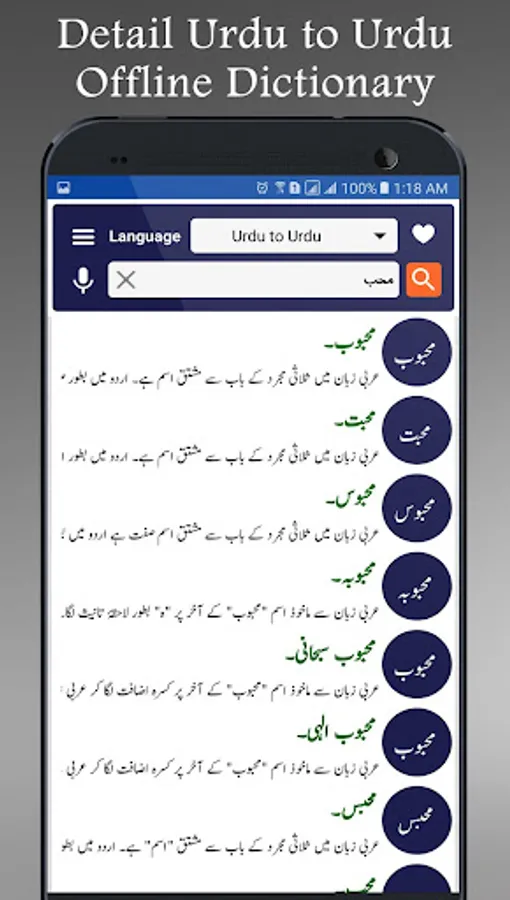 Urdu to Urdu Offline Dictionary – Urdu to Urdu Lughat offline contain 200,000+ words with detail meanings.
