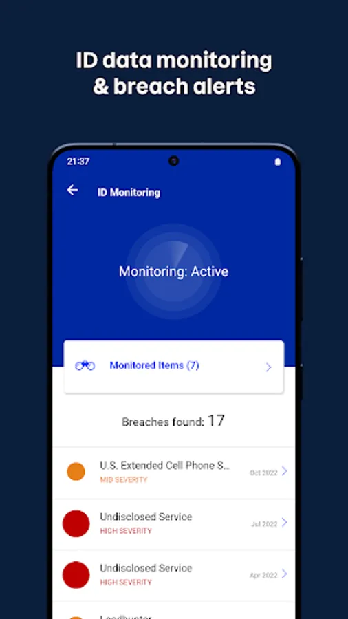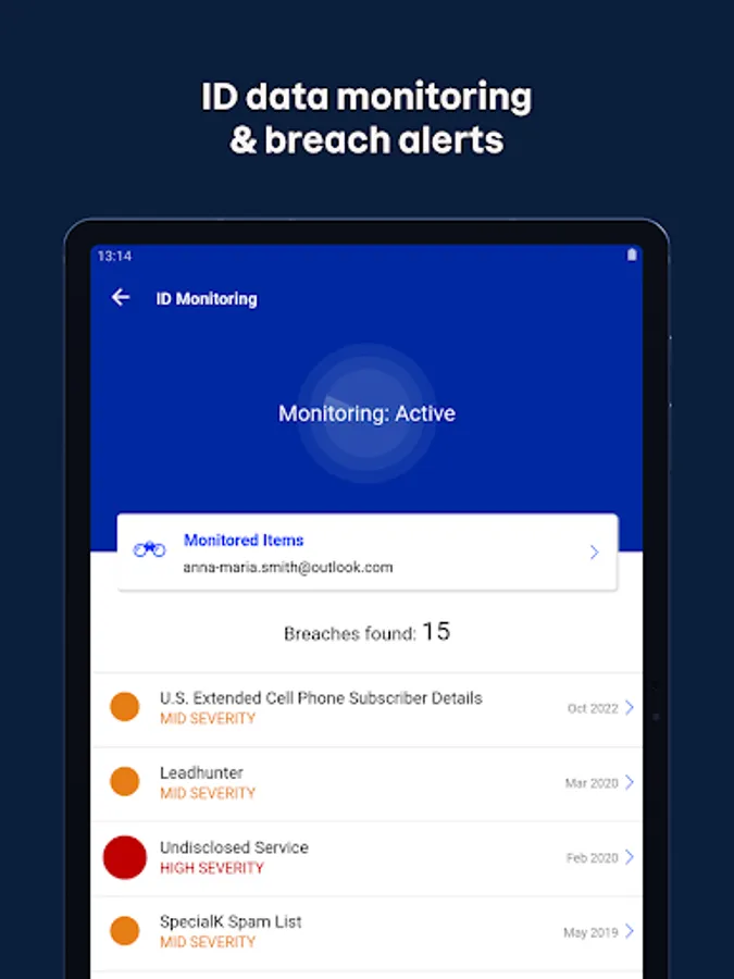 Prevent identity theft with 24/7 dark web monitoring and data breach alerts. If a data breach threatens the personal details within your online accounts, how will you know? Because F-Secure Identity Protection alerts you if that happens. The real-time alerts give you time to secure your details and avoid identity theft
