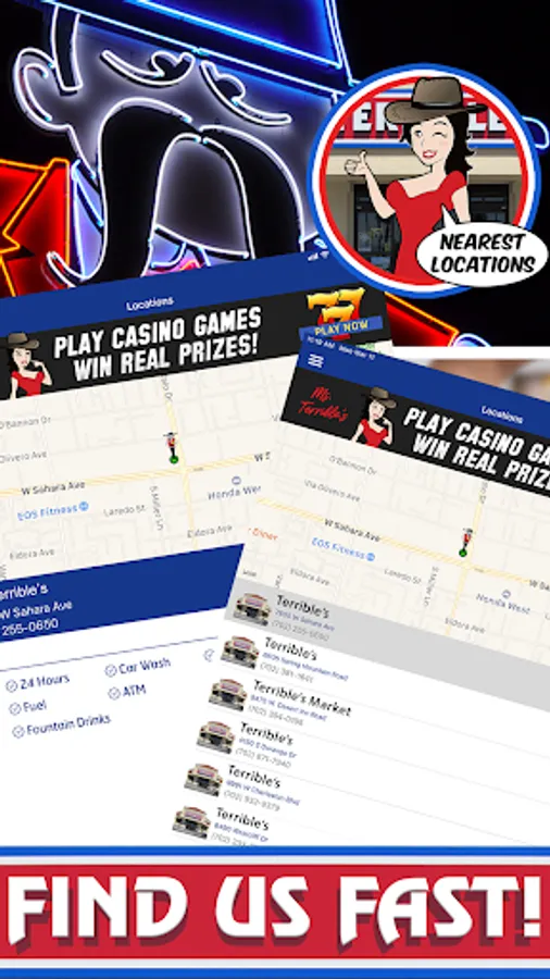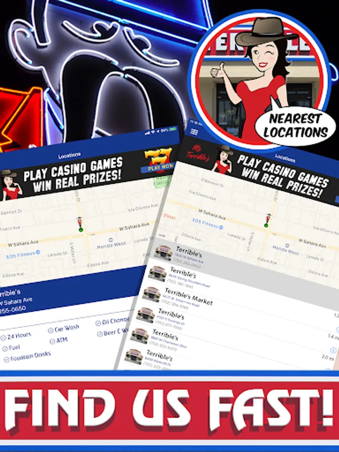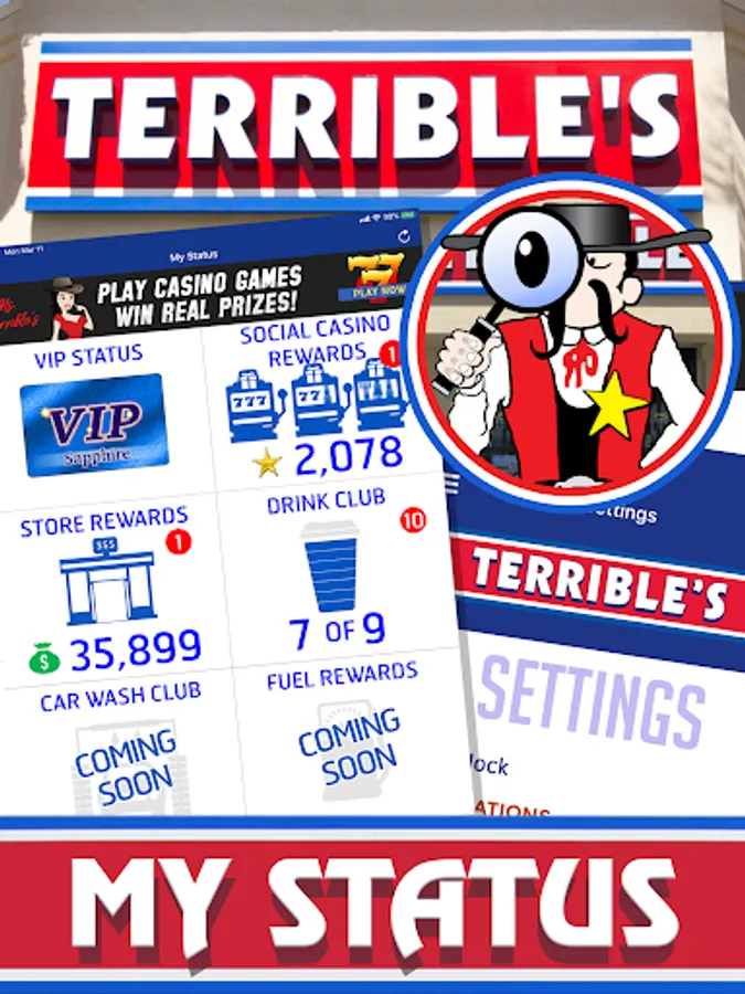 First, you get everything Terrible's! Find your nearest location and its amenities with the intuitive store map locator. Discover and enter Terrible’s current deals & promotions. And, through the My Status page, instantly check your status on Terrible's Social House loyalty programs including the new in-store purchase rebate and better-than-ever drink club.