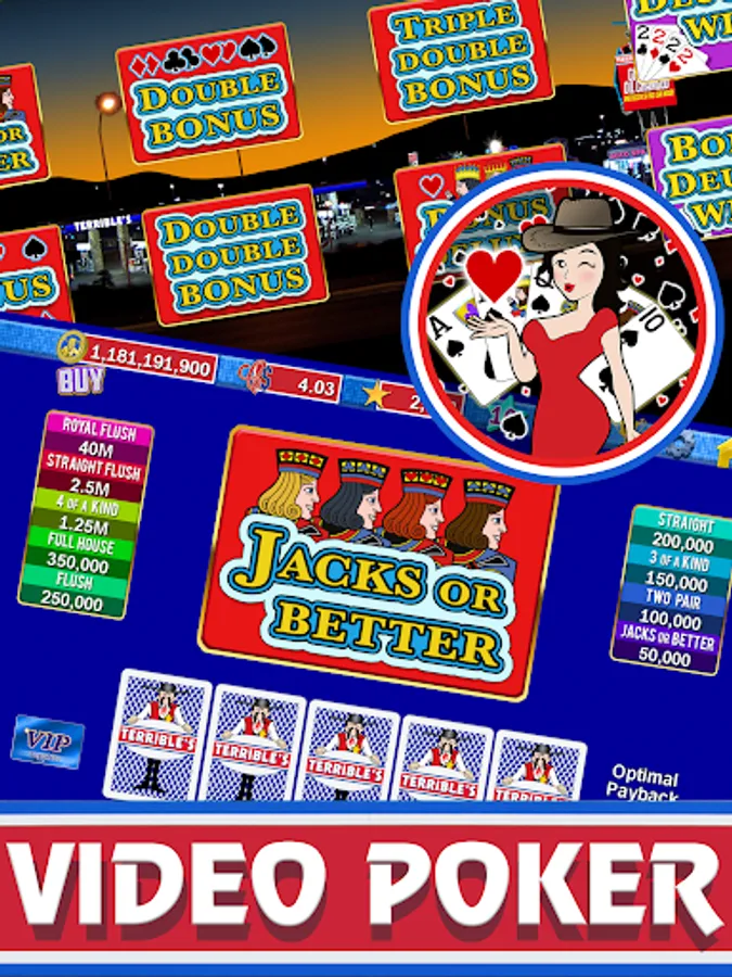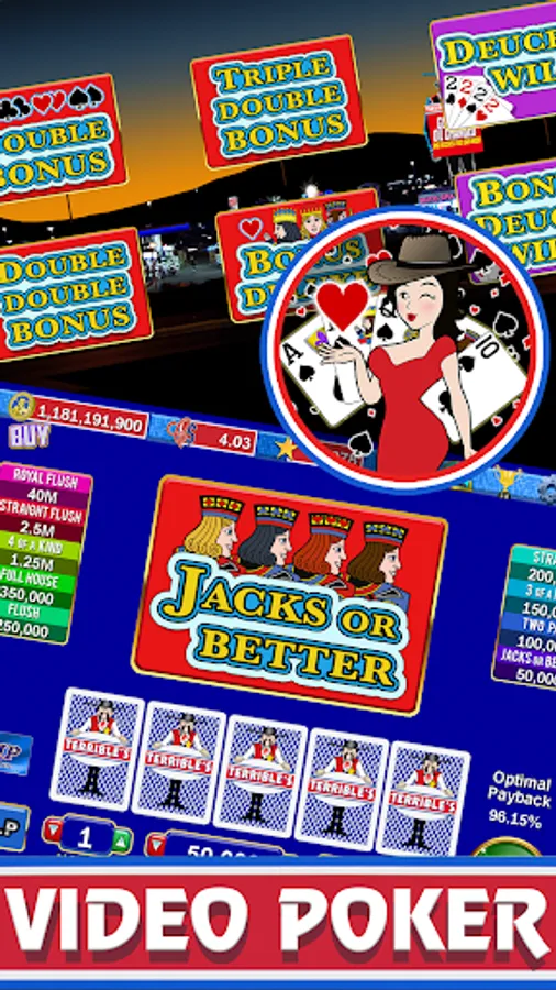Shuffle up and deal! Terrible’s Social House is loaded with 9 multi-hand Video Poker titles -- each with up to 10 hands at the same time! Play the most popular games -- like those in every Las Vegas casino -- Jacks or Better, Bonus Poker, Double Bonus Poker, Double Double Bonus Poker, Triple Double Bonus Poker, Bonus Deluxe Poker, Deuces Wild, Bonus Deuces Wild and even Double Bonus Deuces Wild!