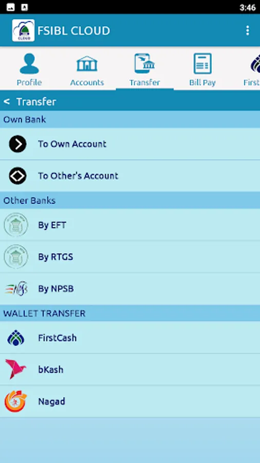 - Transfer money immediately to any local bank through NPSB, EFT & RTGS.