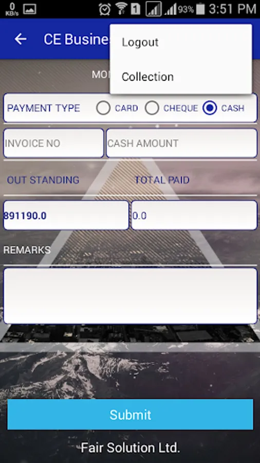 RESKU is an very effective and user friendly android application for sales-officers.It has login screen for business purpose. By credential he will get his outlet stock information with credit for collection in future through three ways like cash, card and cheque. After login by multi-selection functional behavior he can select product for invoice. Every single category products has serial number. User can scan through bar code and its automatically calculate through its unit price, total, number of quantity after scan serial number. If user needs another product to add for invoicing there is an option to avoid complex way so that he doesn't need to go back stock list. Customer information gathering input field needs to fill so that company can inform him future promotion offer. By using resku user can collect money in different way like cash, cheque and card. After collection money outlet outstanding automatically reduced in background process REST API with asp.net c# and sql server 2008-2014.