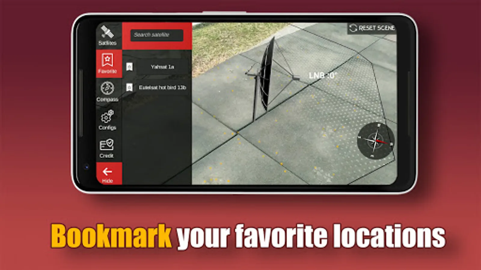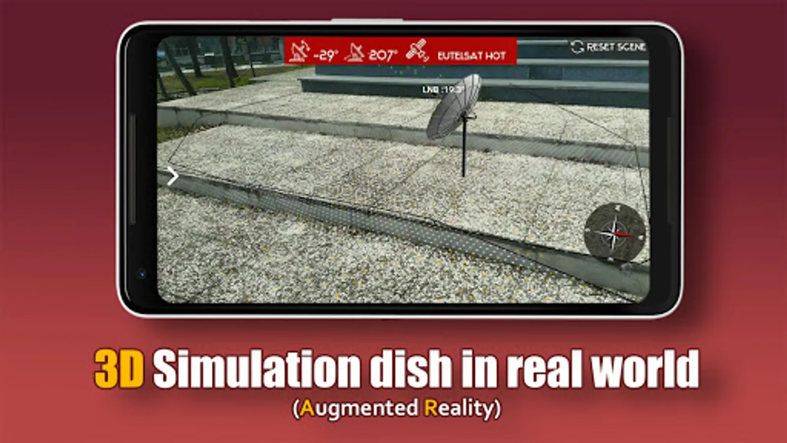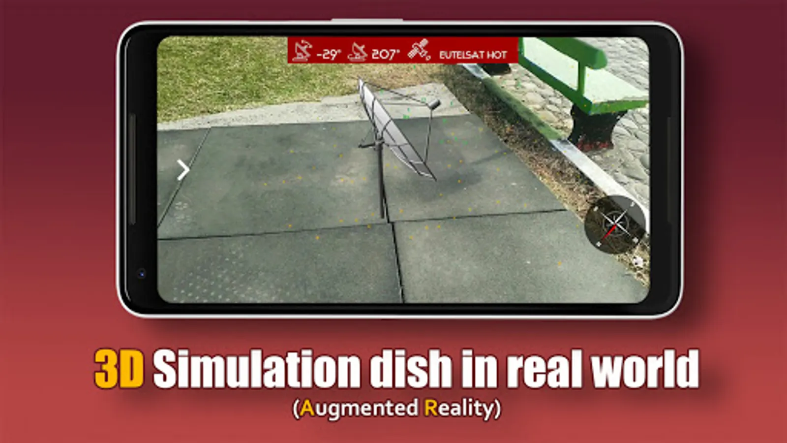 "Easy AR Satellite Finder (augmented reality)" is a free tool designed to help you setting up your satellite Dish (the Dish). Based on a given location it determines the angles of azimuth and elevation and shows you in which direction to point your Dish. The result can be seen on compass and on real world by using your mobile camera. It also has a great compass to help you.
