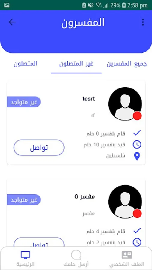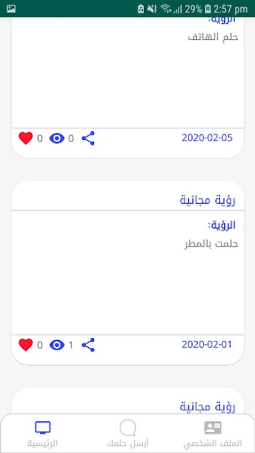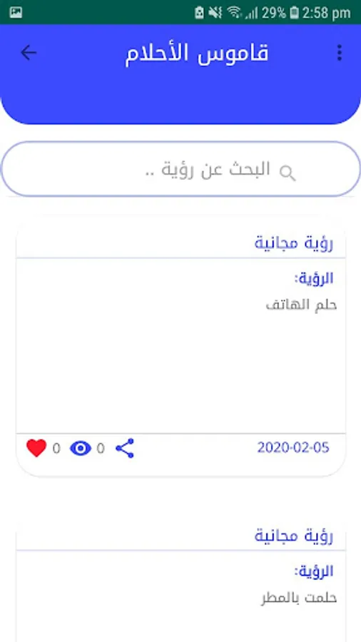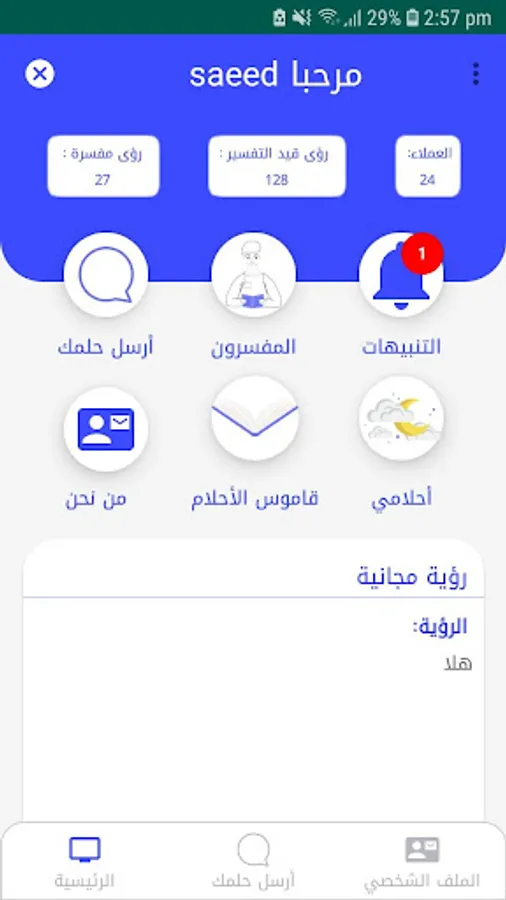 It connects people who want to interpret their dreams with interpreters, where the user can send the dream to himself or someone else or talk to the interpreter by chatting or sending the vision in the form of a voice message, he can browse all dreams whether they are interpreted or under interpretation and see comments on them, he can search for a vision Designated by a filter, sharing and liking visions and many other things