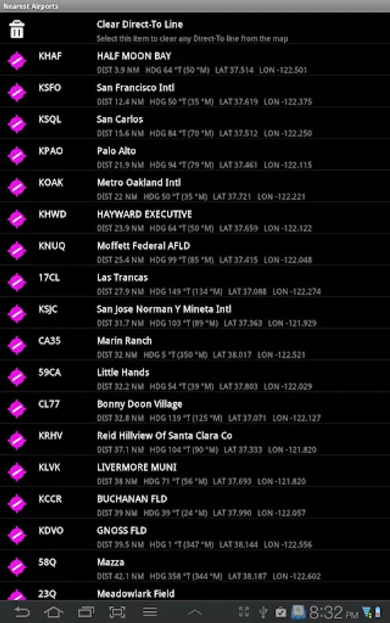 - Nearest airports lookup including distance and heading for airports, seaplane facilities and helipads