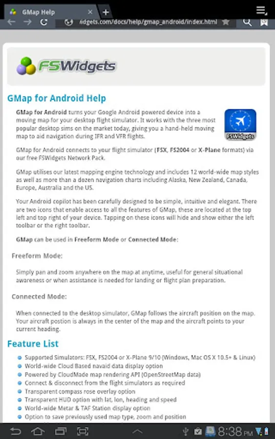 FSWidgets GMapHD turns your Android powered phone or tablet into a moving map for your favourite desktop flight simulator including FSX, FS2004, X-Plane 9 and X-Plane 10 (including support for X-Plane 10.20+ 64bit mode).