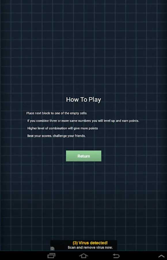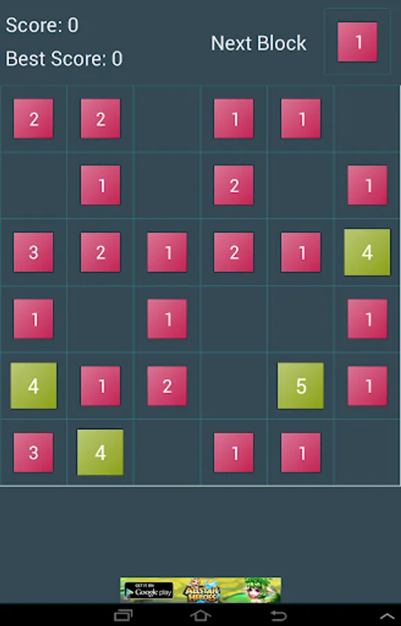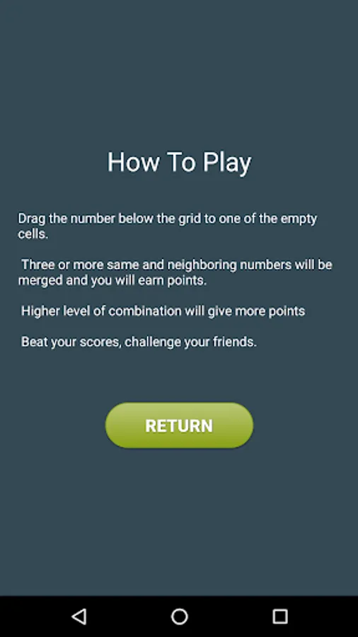 The goal of the merge numbers is to earn points as much as possible. Drag the number below the grid to an empty cell to place the next number. The next number is shown below the grid. If you combine three of more adjacent same numbers you will make it bigger and earn points.