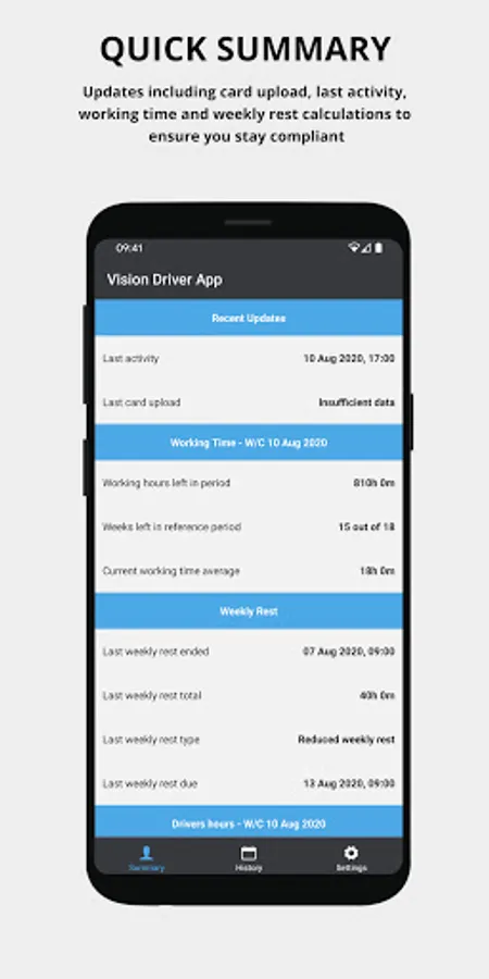 Keep track of your most recent driving updates including card upload and last activity. Key working time and weekly rest figures such as last weekly rest totals and types are displayed, as well as Drivers’ hours and the number of hours driving still available that particular week. The start of your next shift completes the page to ensure legislation is followed.