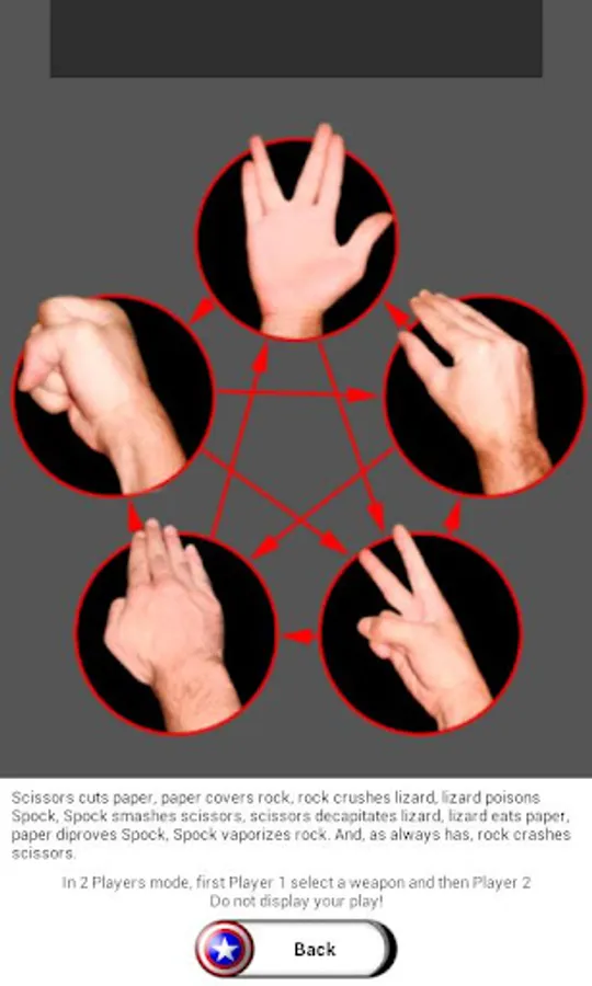 Scissors cuts paper, paper covers rock, rock crushes lizard, lizard poisons Spock, Spock smashes scissors, scissors decapitates lizard, lizard eats paper, paper diproves Spock, Spock vaporizes rock. And, as always has, rock crashes scissors.