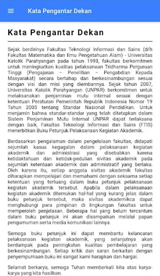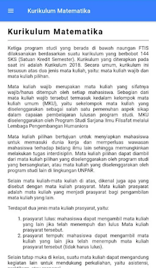 Pada aplikasi ini, terdapat informasi umum mengenai FTIS UNPAR yang dapat berguna untuk mahasiswa dan siapapun yang membutuhkan informasi sekitar perkuliahan di FTIS UNPAR.