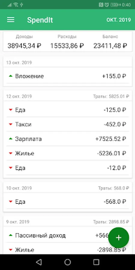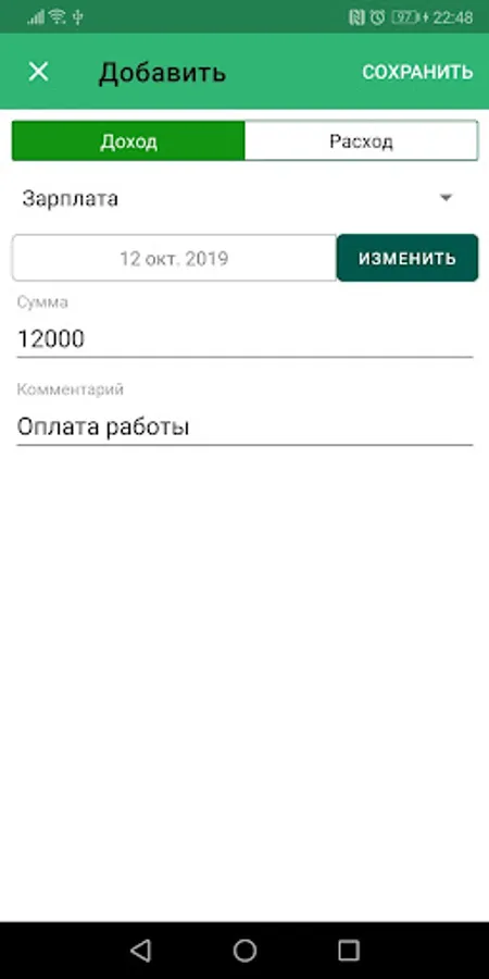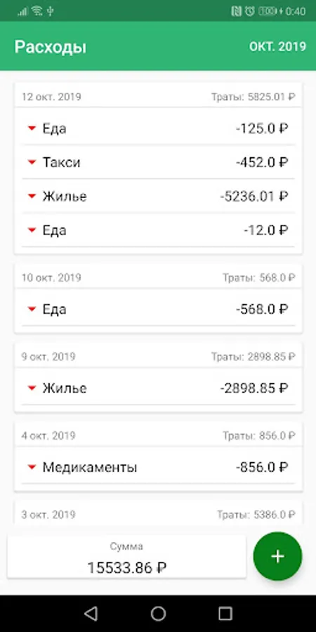 Instant display of any financial transactions and calculation of the amounts of income, expenses and balance.