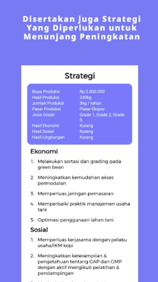 Sistem ini dirancang untuk memudahkan peneliti untuk menilai tingkat keberlanjutan rantai pasok pada kopi. Kerbelanjutan dinilai berdasarkan variabel ekonomi, sosial dan lingkungan. Penilaian keberlanjutan dilakukan mulai ditingkat petani, tengkulak dan roastery. Hasil penilaian keberlanjutan ditunjukkan berdasarkan indeks keberlanjutan, sehingga dapat dikelompokkan berdasarkan kategori buruk, kurang, cukup, dan baik. Dengan menggunakan sistem ini, peneliti akan mudah untuk menentukan rekomendasi strategi perbaikan untuk meningkatkan keberlanjutan rantai pasoknya.