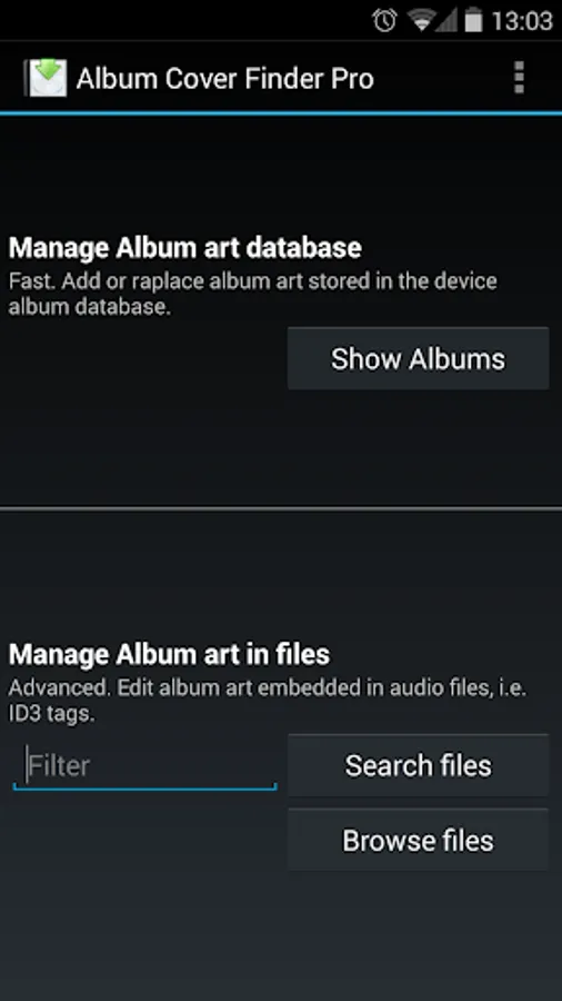 - Fast option. Album covers can quickly be added to the device media store database, so the same cover shows when the song is played in Android media player. One image per album can be saved.