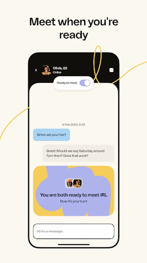 Never sure when you should ask your Crush on a date? Afraid they might say no? Or are you sick of the pressure when someone asks you out too soon? No more stress. Now you can tell us when you're ready to meet, directly in your chat with your Crush. We'll let you know when they're ready too.