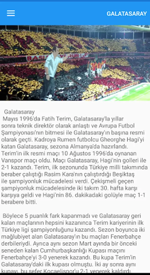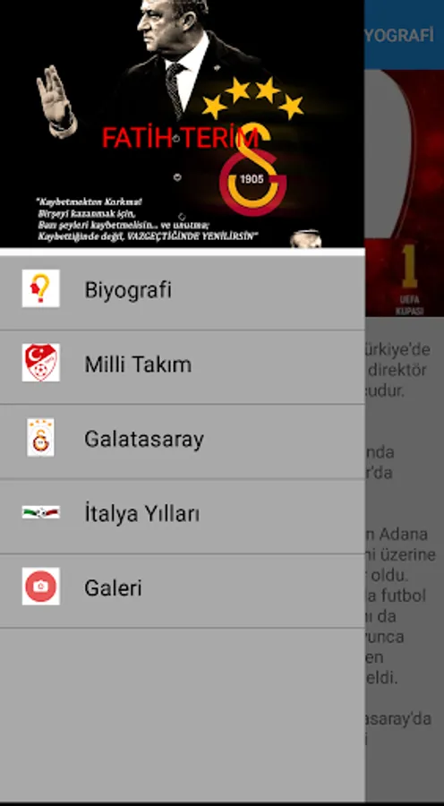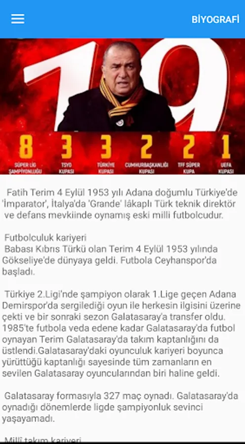 It is a biography application prepared for our great teacher "Emperor Fatih Terim", who is a monument of success who has made outstanding contributions to our country's football and even world football, broke records that are hard to break, and opened new horizons for our country's football. May it be a gift to him and the entire Galatasaray community.