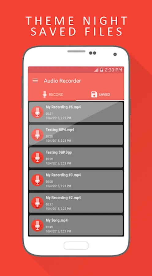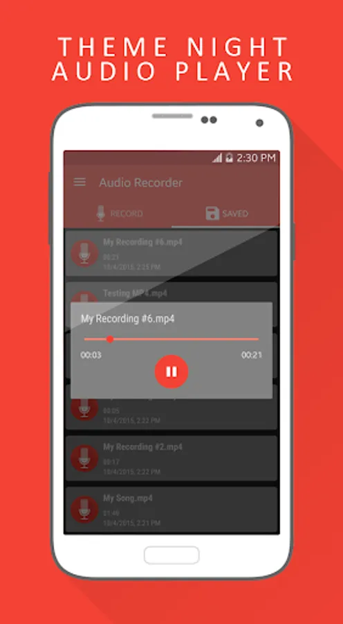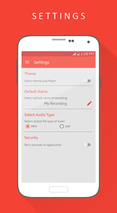 Audio Recorder provides you high quality audio recording in multiple audio formats with ACC encoding. Attractive user interface and simply designed layouts gives an easy approach to major functionalities. Audio Recorder provides you voice amplitude analyzer inside the mic. So you can visualize your voice amplitude while recording quality audio. Audio Recorder keep your privacy at first preference by adding a security lock to the application. So no one can listen to your private recordings. Audio Recorder comes with two different themes a Day Theme and a Night Theme.