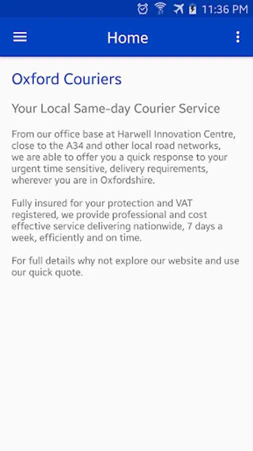 From our office base at Harwell Innovation Center, close to the A34 and other local road networks, we are able to offer you a quick response to your urgent time sensitive, delivery requirements, wherever you are in Oxfordshire. Fully insured for your protection and VAT registered, we provide professional and cost effective service delivering nationwide, 7 days a week, efficiently and on time.