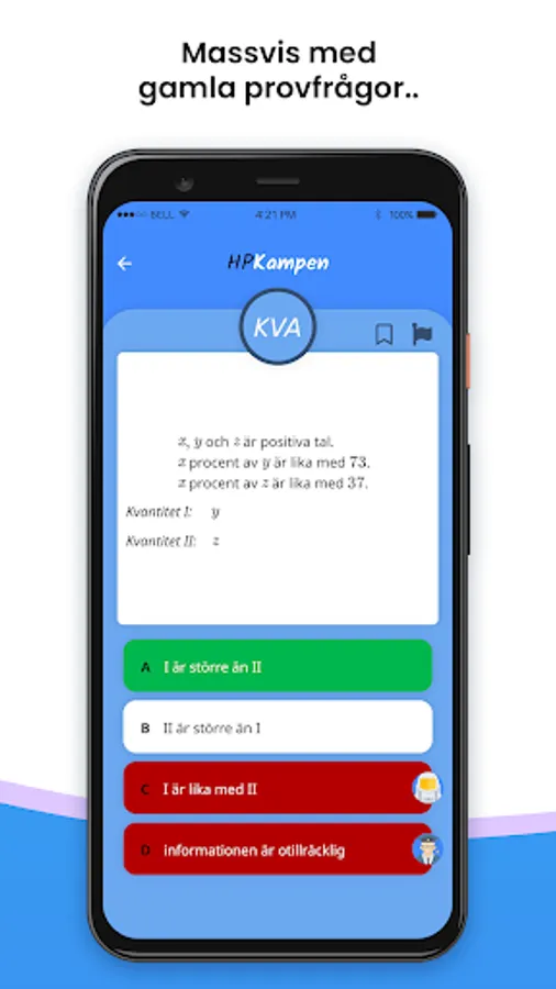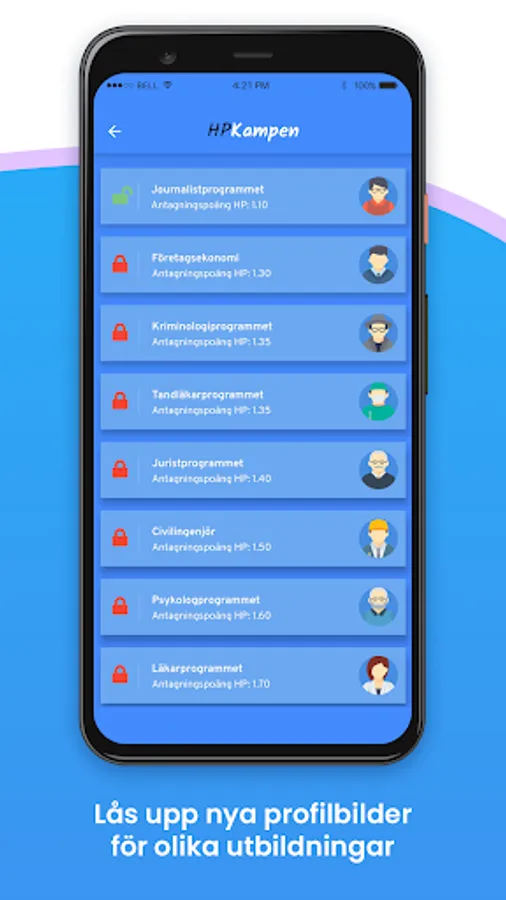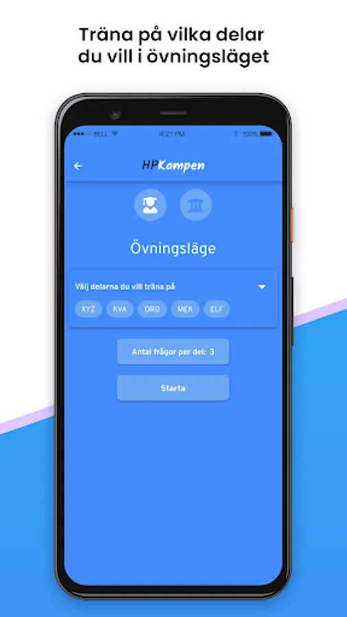 In the training mode, you can practice on questions by choosing between all the university entrance exam's 8 categories. If you have HPKampen Premium, you can also do a test session or an entire test, which is the best way to train for the real college test. With your best result, you can also unlock new profile pictures for different educations.