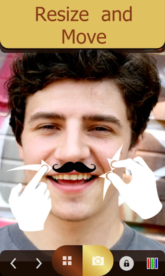 When you first look into the phone - randomly chosen moustache shows up which follows your face. You can select another one easily. Press the Lock button if you want to fix it to the screen so it won't be following your face any more.