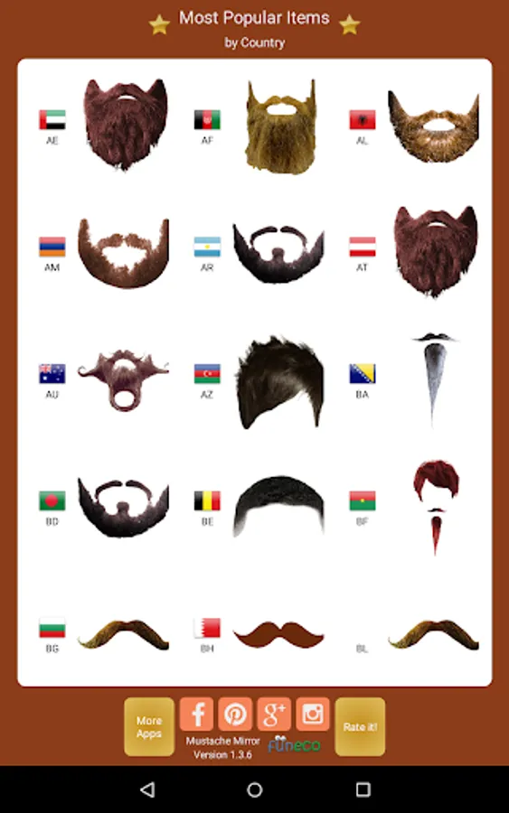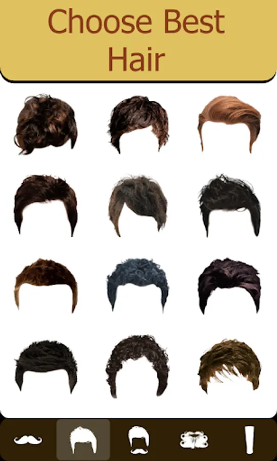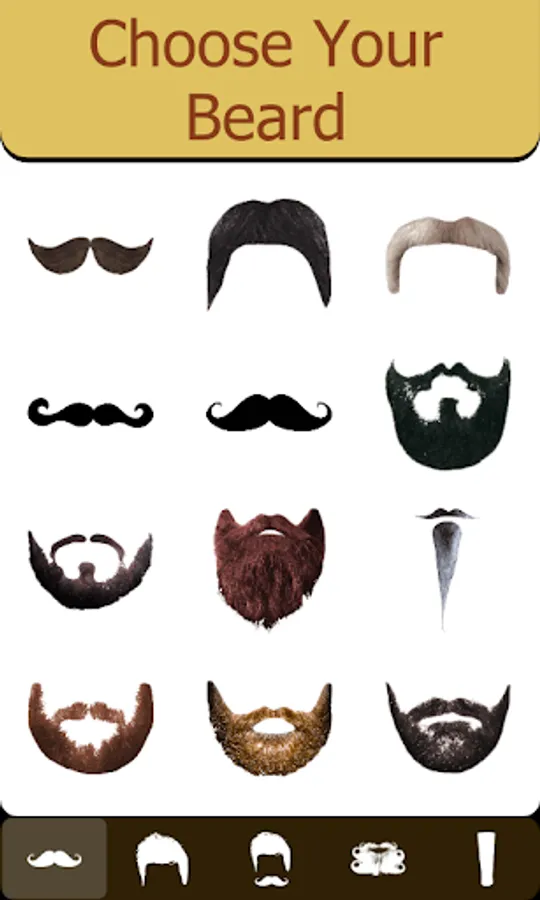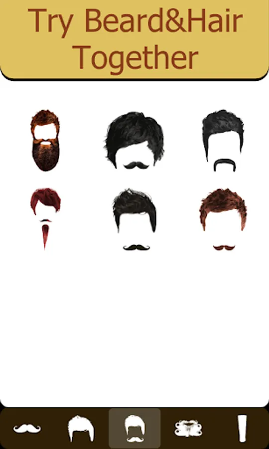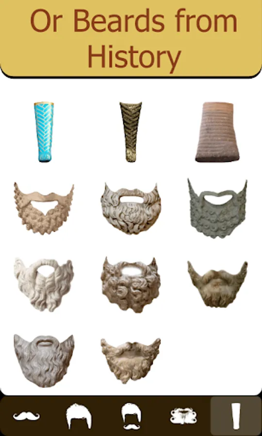 Choose from more than 90 facial hair in 5 categories: real beard and mustache, men's hair, men's hair together with moustache, cartoon and historical. Make yourself a true pharaoh beard or get one from real ancient statues or go with a pink one.