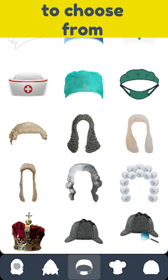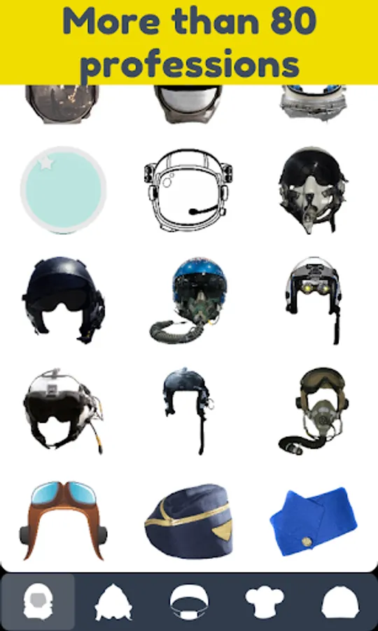 Professions are represented with typical hats, helmets or caps. You can choose from more than 80 and are they divided into 5 categories: