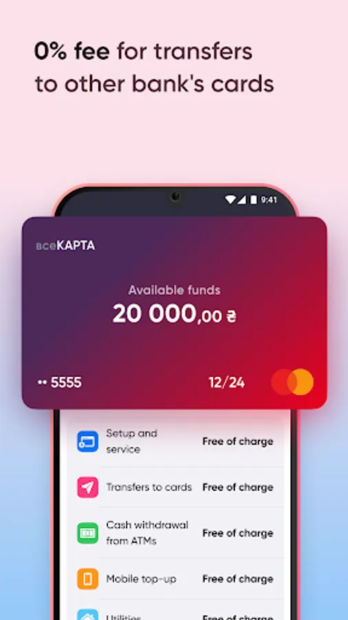 - 0% on transfers to cards of other banks in hryvnia (with vseKARTA) by card number or phone number