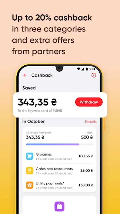 The maximum amount of the cashback reward is 500 UAH. Taxes and fees are withheld - 19.5%. Cashback refers to the accrual of cashback as part of the «Тепер Ваш мобільний кешбек із ПУМБ» Promo, provided that the appropriate category is selected in the FUIB Online mobile application. The offer is valid from September 01.09.2023 to October 31.10.2023. Details at pumb.ua