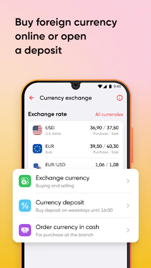 - buy dollars and euros in the application up to 50,000 UAH per month