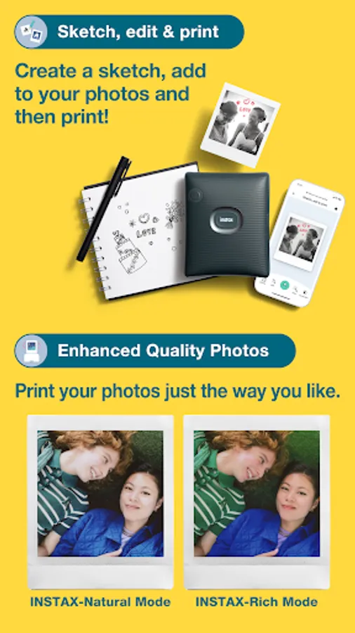 Print your photos just the way you like, whether it's with the conventional photo quality of ""INSTAX-Natural Mode"" or the new ""INSTAX-Rich Mode"", which features extra-vibrant color.