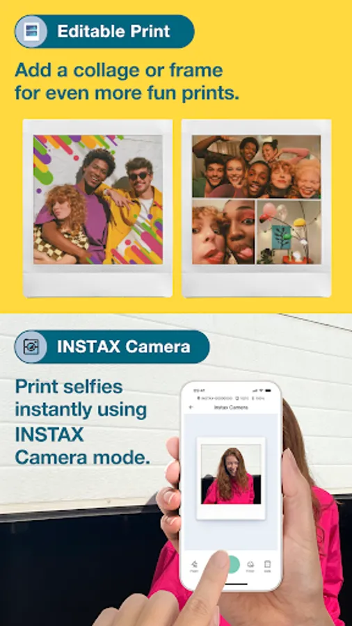Print selfies instantly using INSTAX Camera mode. Take a snap in the app and then swipe up to print!