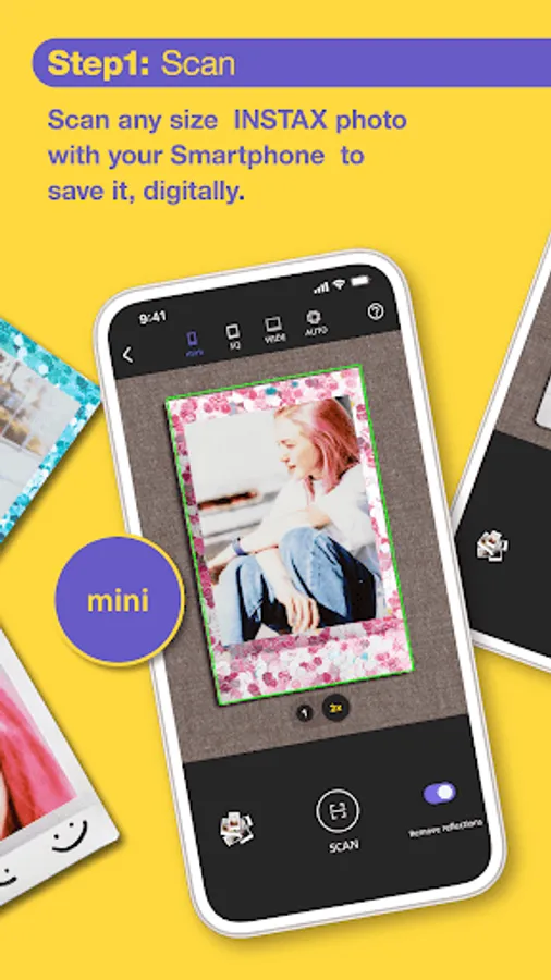Hold your Smartphone over an INSTAX MINI, SQUARE or WIDE photo when in Scan mode to save your INSTAX photos, digitally. The INSTAX UP! App scans and imports the entire INSTAX photo, including the instant film frame.