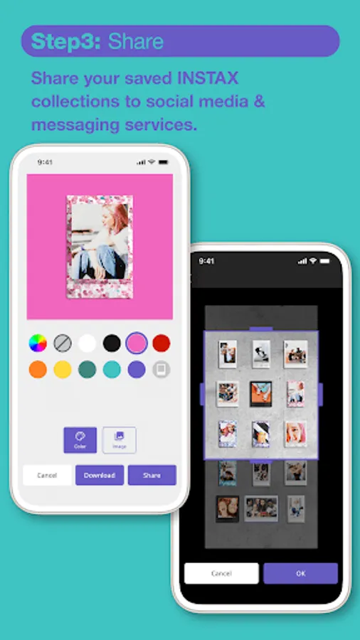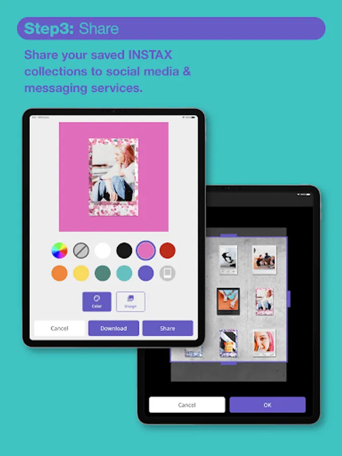Use the INSTAX UP! App to easily share your saved INSTAX photos & collections to social media and messaging services.