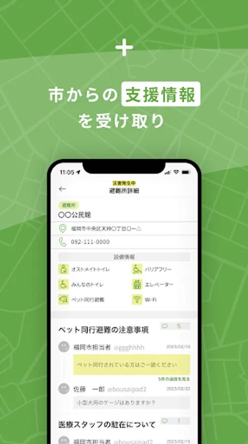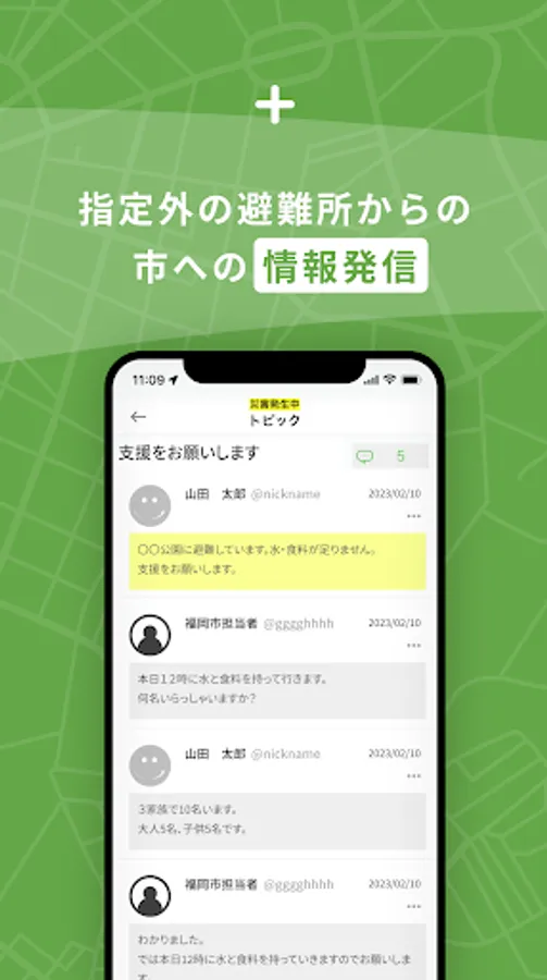 When you switch to disaster mode, you will be able to post topics that could only be viewed in normal times, and you will be able to share information within the shelter. Support information from Fukuoka City is also provided using this topic function.