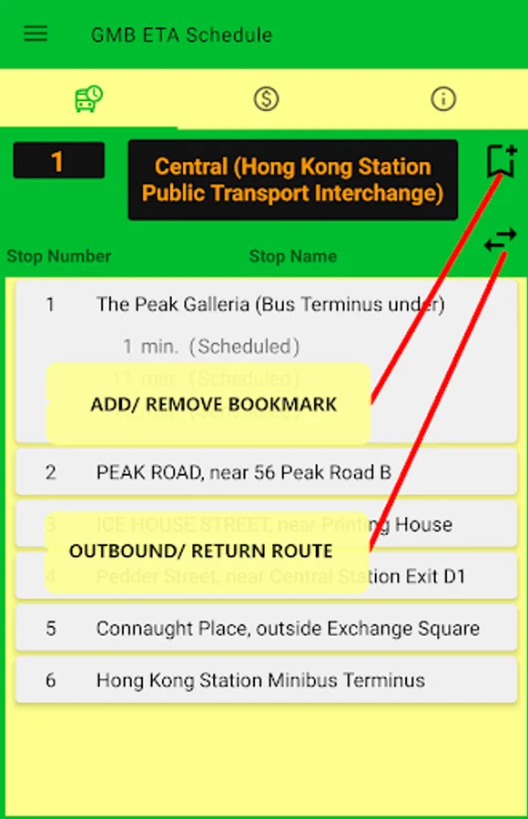 ◼ listing the latest 3 upcoming/scheduled(if available) minibus arrival information on each bus stop for the selected bus route;