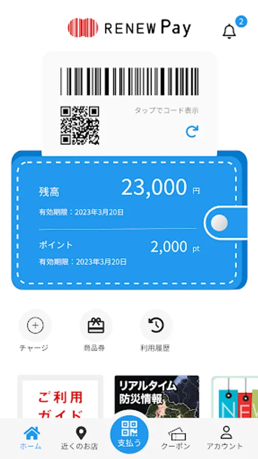 Digital gift certificate with premium. If you charge 5,000 yen, you can use it to pay 6,000 yen at participating stores.