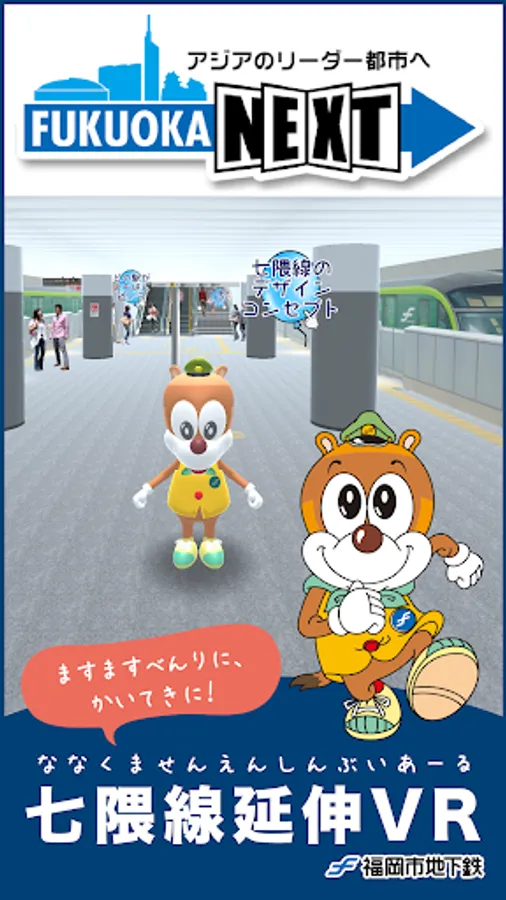 福岡市地下鉄のマスコット:ちかまる,環境キャラクター:メコロを操作して将来の七隈線新駅を散策することができます。プラットフォームから出口まで順路に沿って歩き回りながら,地下鉄に関する様々なクイズに挑戦していただきます。ちかまるとメコロが歩く新駅はVRで表現される立体空間です。これから作られる七隈線の二つの駅を先取りして体験してください。