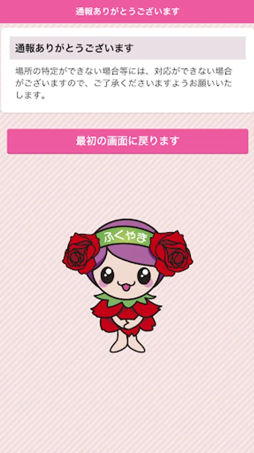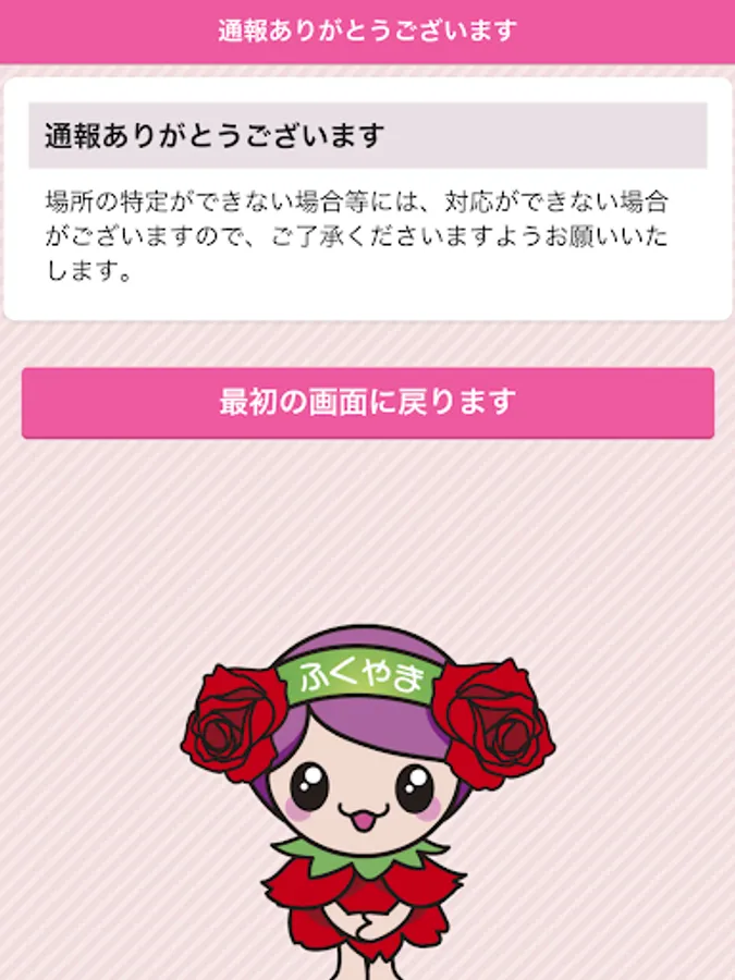 By - "notification in the app", please understand that Fukuyama is to get the user's personal information (e-mail address and location information). It acquired personal information, except for the cases where there is a provision in the laws and regulations, and manage on the basis of the Fukuyama City ordinance of privacy protection.