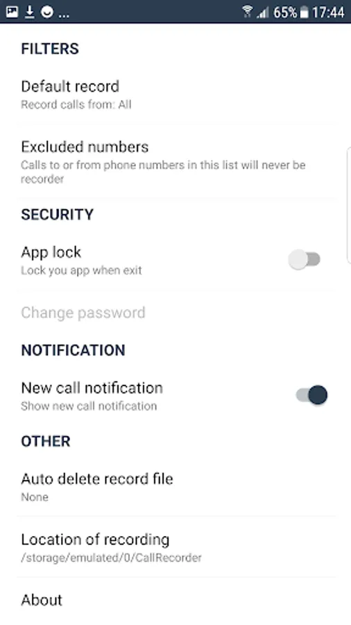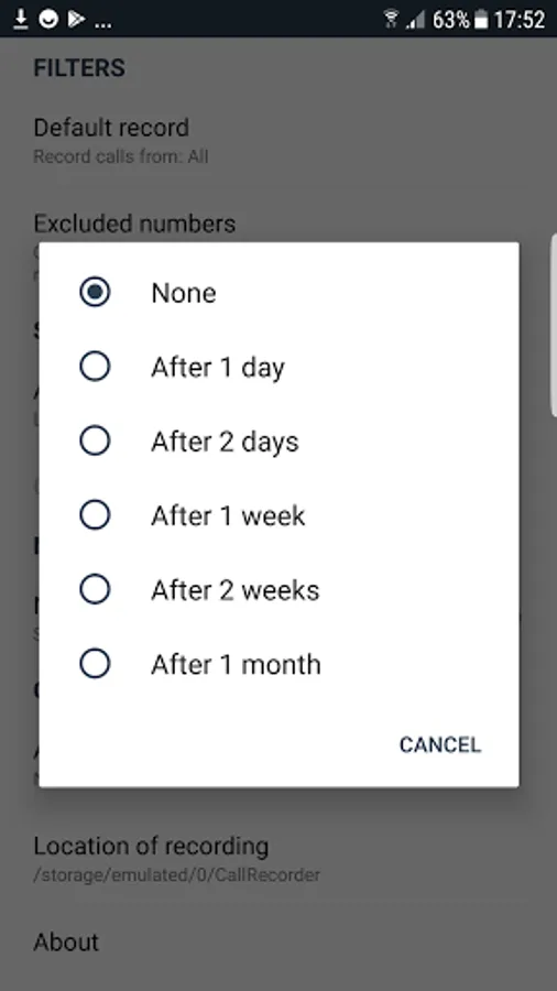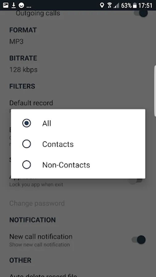 Record everything (default) – This setting records all calls except for contacts pre-selected to be ignored ( excluded numbers).