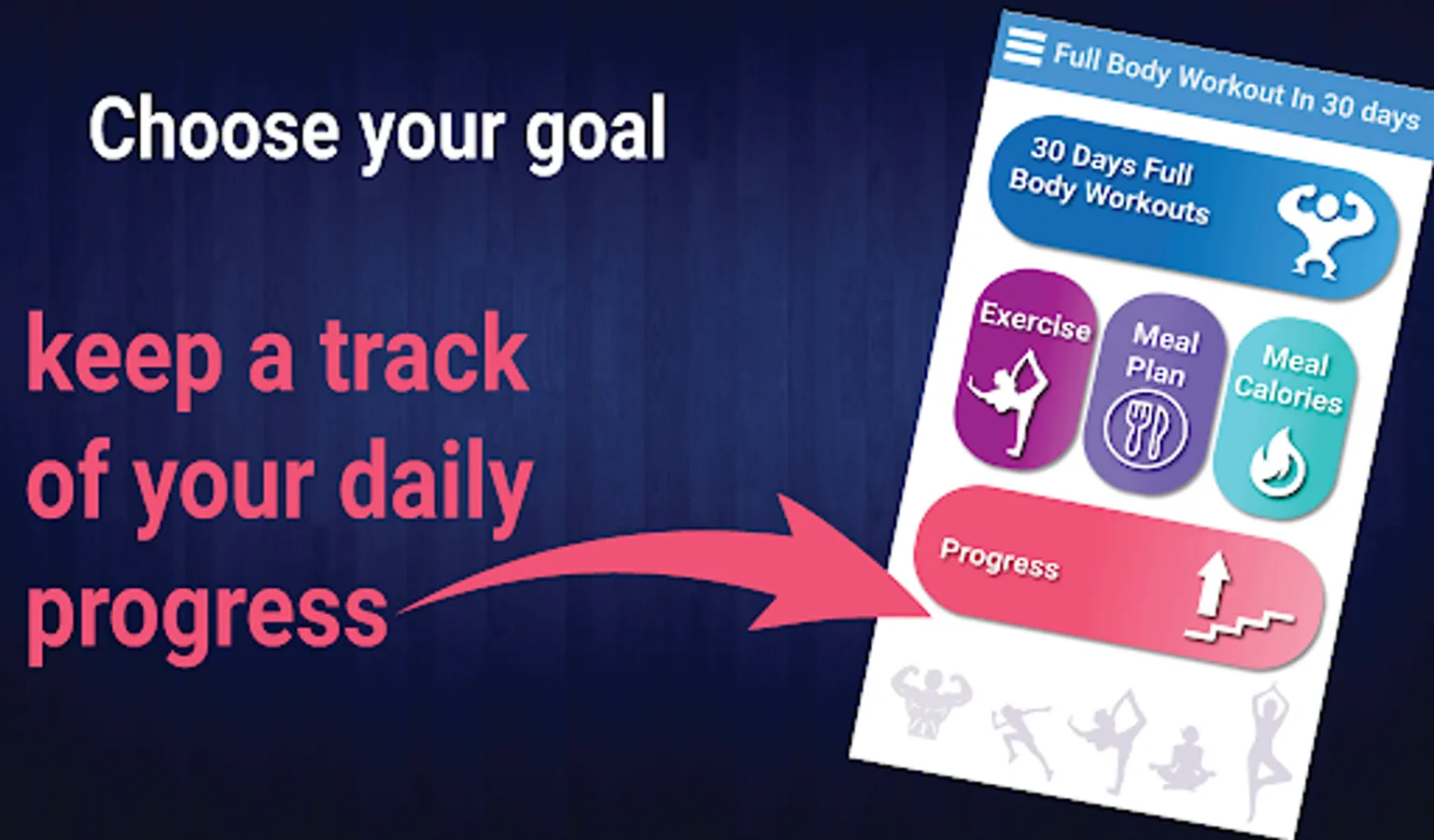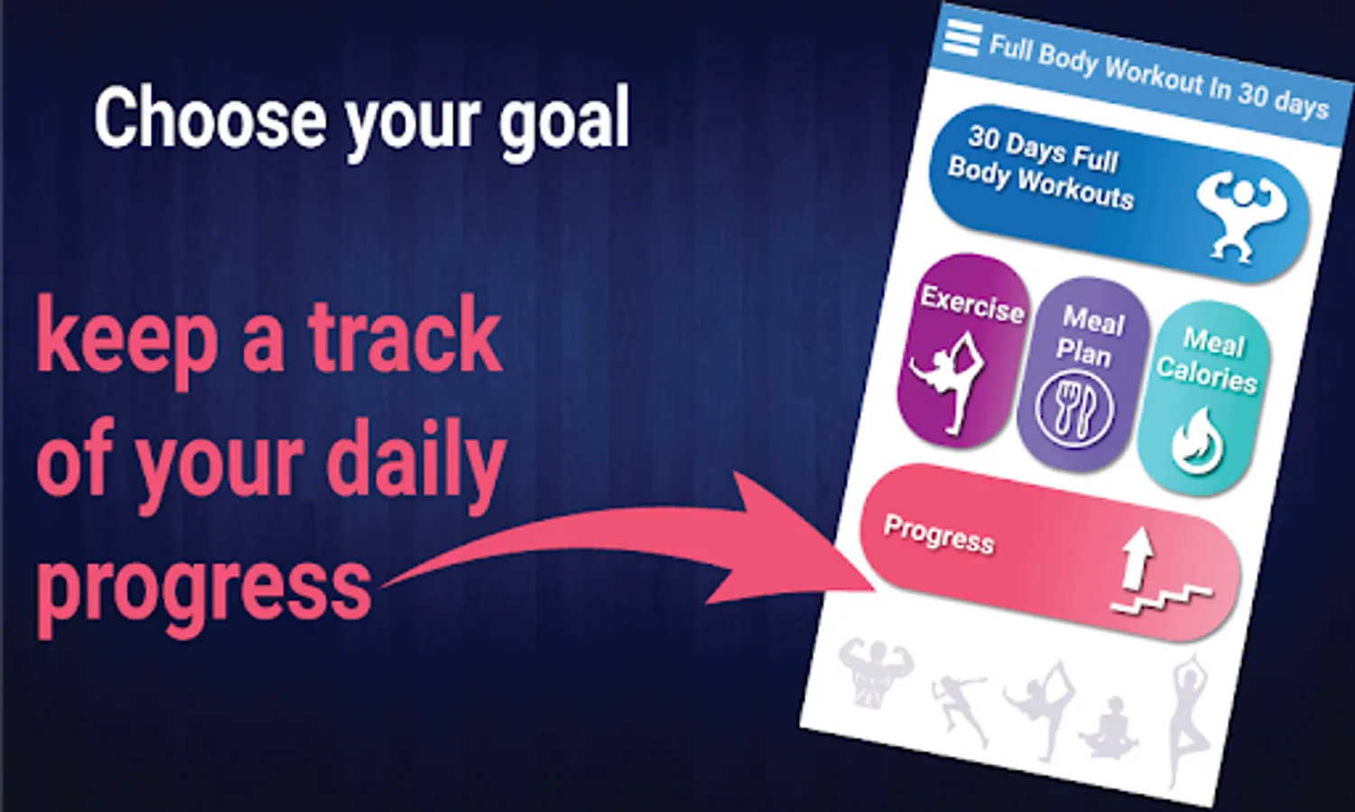 Progress is very important in fitness world. This app will noticed the day you begin to this fitness way and will remind you how many days you work out.