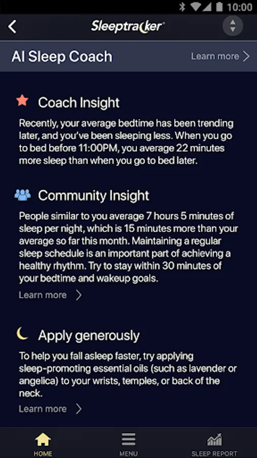 The AI Sleep Coach, powered by the Sleeptracker® Artificial Intelligence Engine, provides effective, easy-to-implement, personal sleep tips based on a comprehensive analysis of individual sleep patterns.