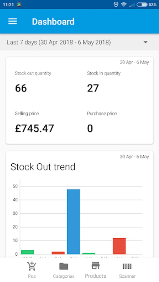 • Dashboard: you can see all the statistics about your warehouse by date range: total number of products, total cost, stock trend