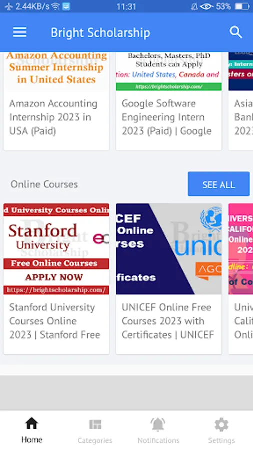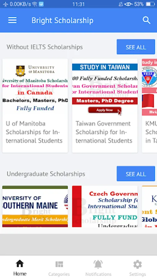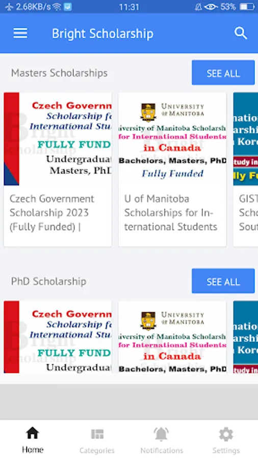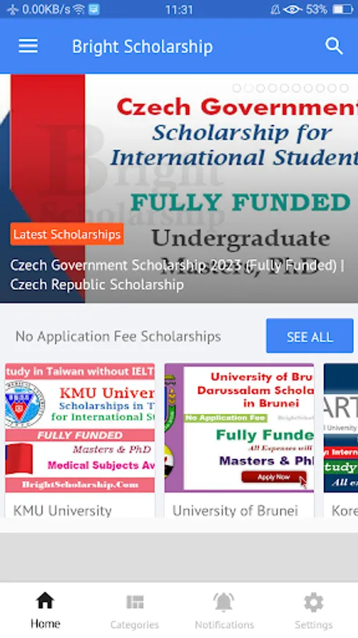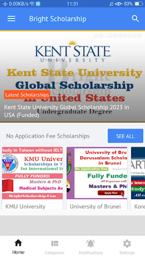 Bright Scholarship App will help students to find Fully Funded Scholarships in top universities of the world. This app provide informational related to Bachelor's Degree Scholarships, Masters Degree Scholarship, PhD Degree Scholarships, Internships in top Companies, Best Fellowships and many more.