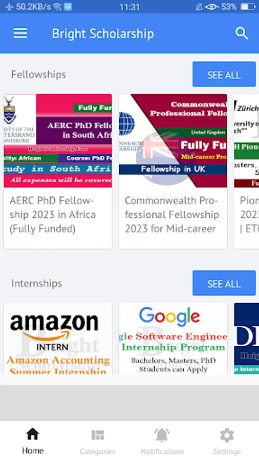 Bright Scholarship is a comprehensive Android application that aims to help students achieve their academic and professional goals by providing them with valuable information about Fully Funded Scholarships, Internships, Fellowships, and Jobs. The app caters to students of all levels, including bachelors, masters, and Ph.D. degrees, and provides information about scholarships in various countries across the world.